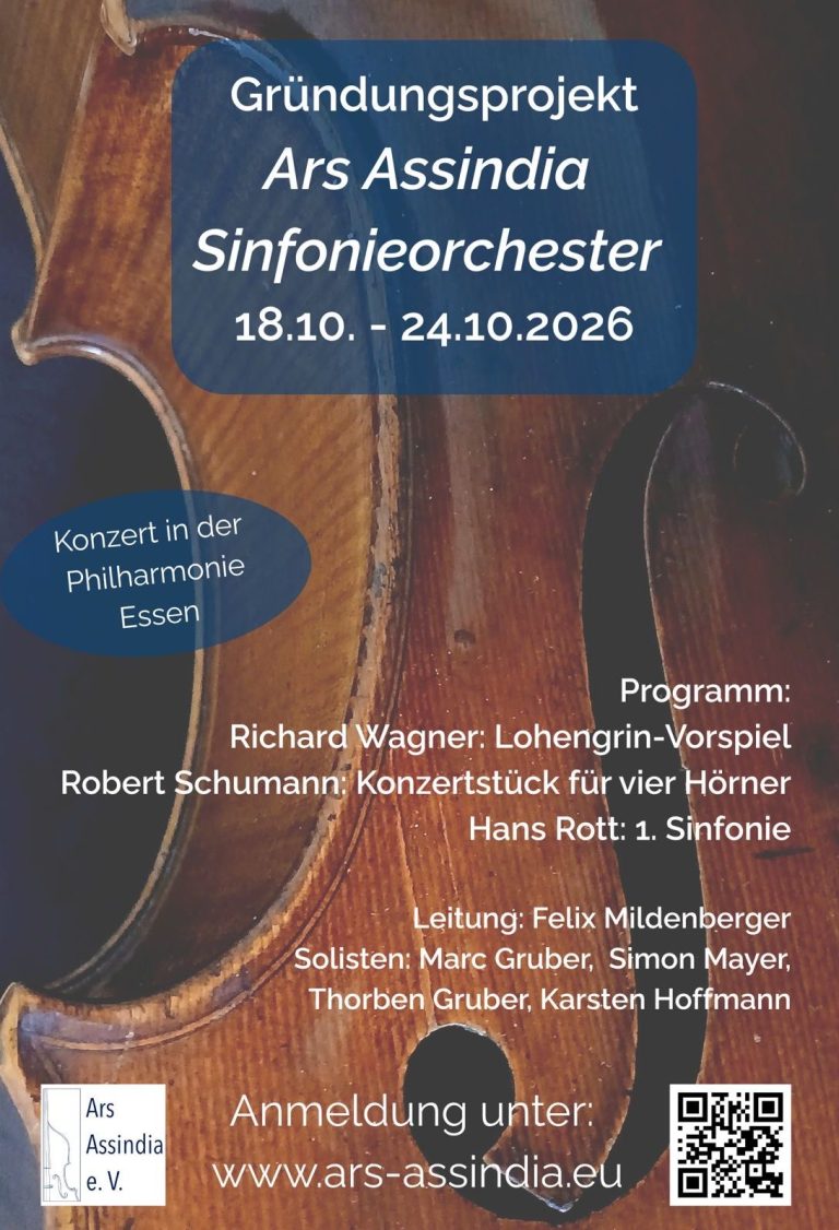 Unser Netzwerk, benannt nach Essens historischem Stadtnamen Assindia, wurde 2025 von ehemaligen Mitgliedern des Essener Jugend-Symphonie-Orchesters gegründet. Es verbindet Menschen in Europa, in deren Leben Orchester- und Kammermusik eine zentrale Rolle spielt oder die sich ihr mit Offenheit nähern möchten: beruflich und privat, musizierend sowie zuhörend. Wir verstehen diese Musikform nicht als Reproduktion oder Event. Vielmehr sehen wir sie als einen Resonanzraum für echten gesellschaftlichen Dialog und somit als Gegenentwurf zur digitalen Anonymität.